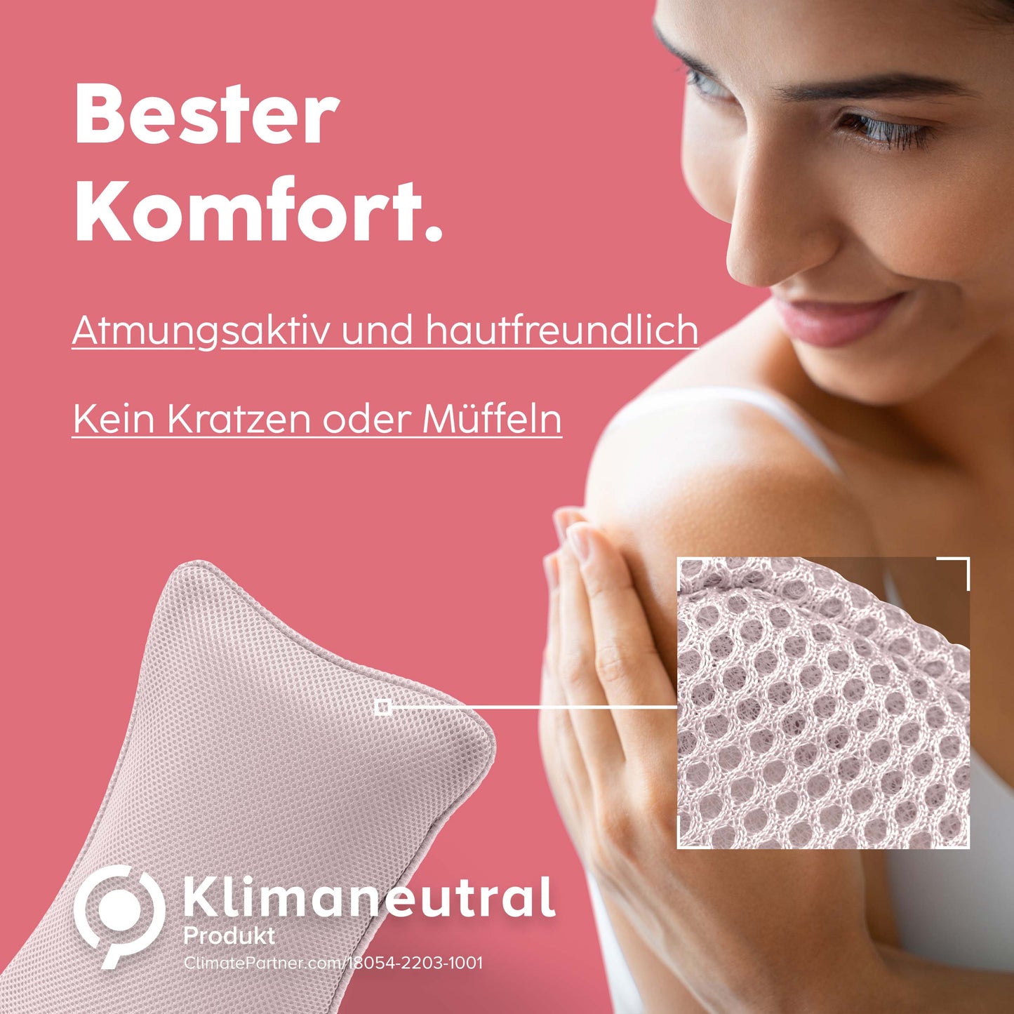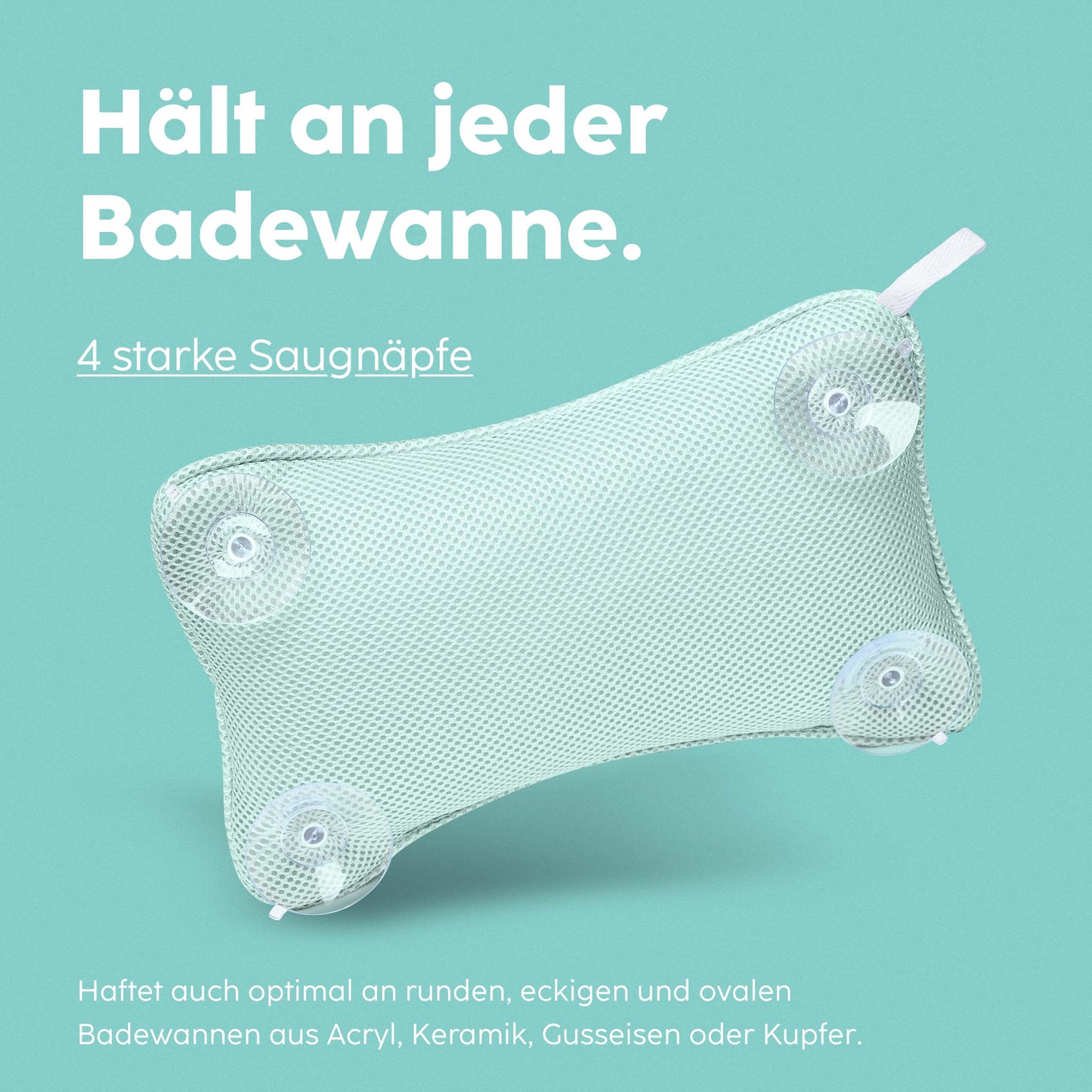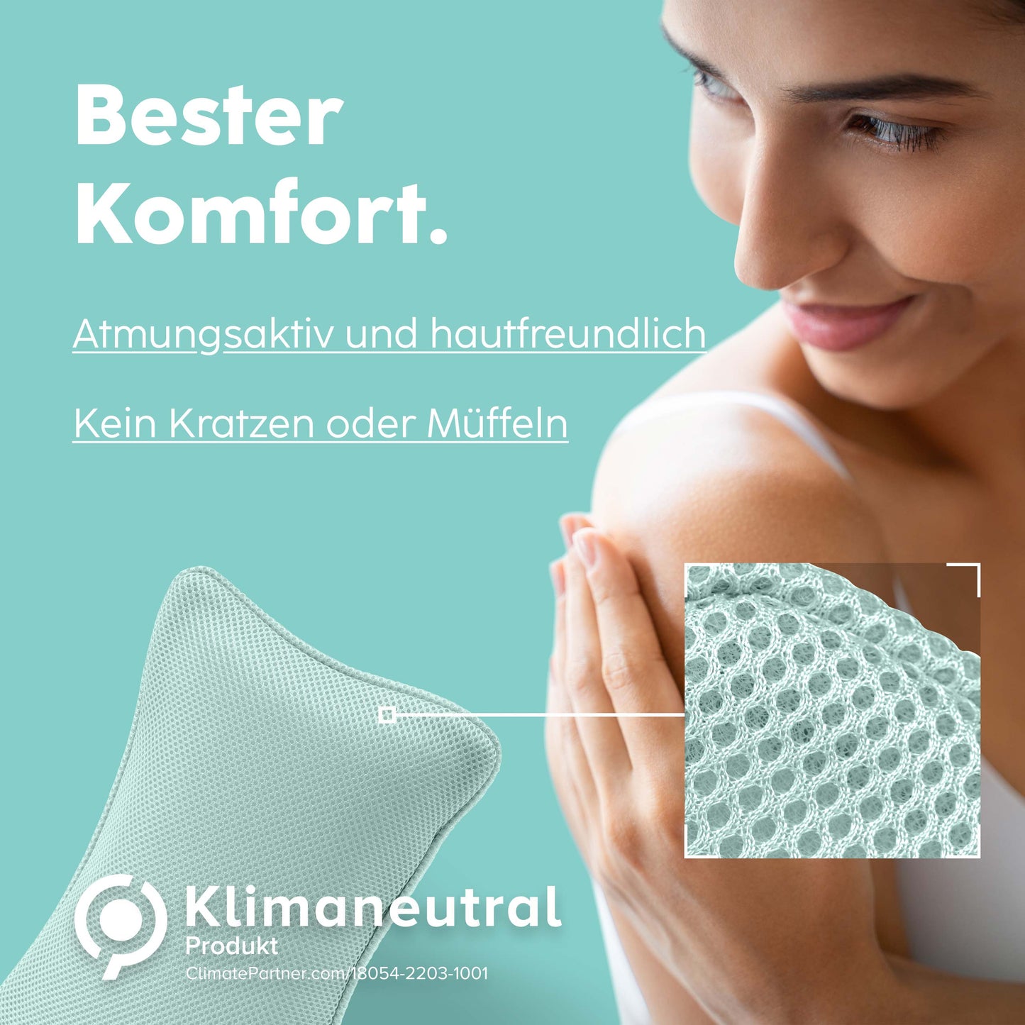 Unser kompaktes Badekissen besteht aus einem hautfreundlichen Material, das sich weich anfühlt und nicht kratzt. Die atmungsaktive Struktur verhindert unangenehme Gerüche und hält das Kissen hygienisch.