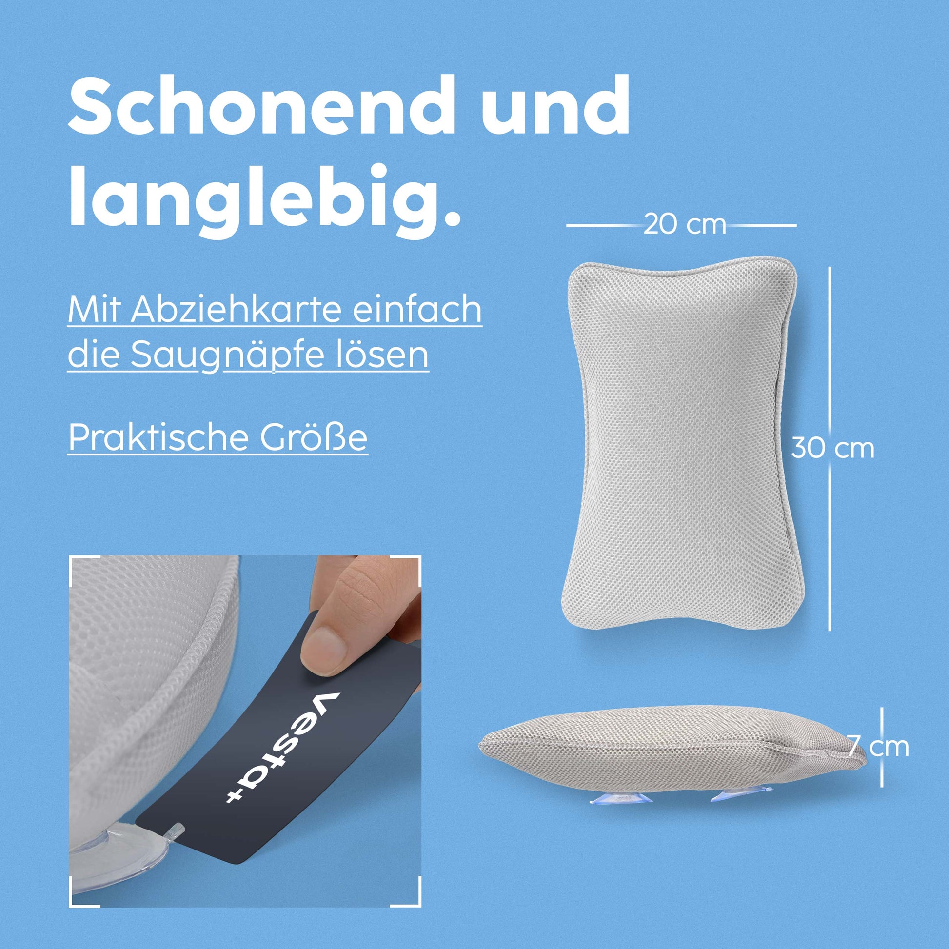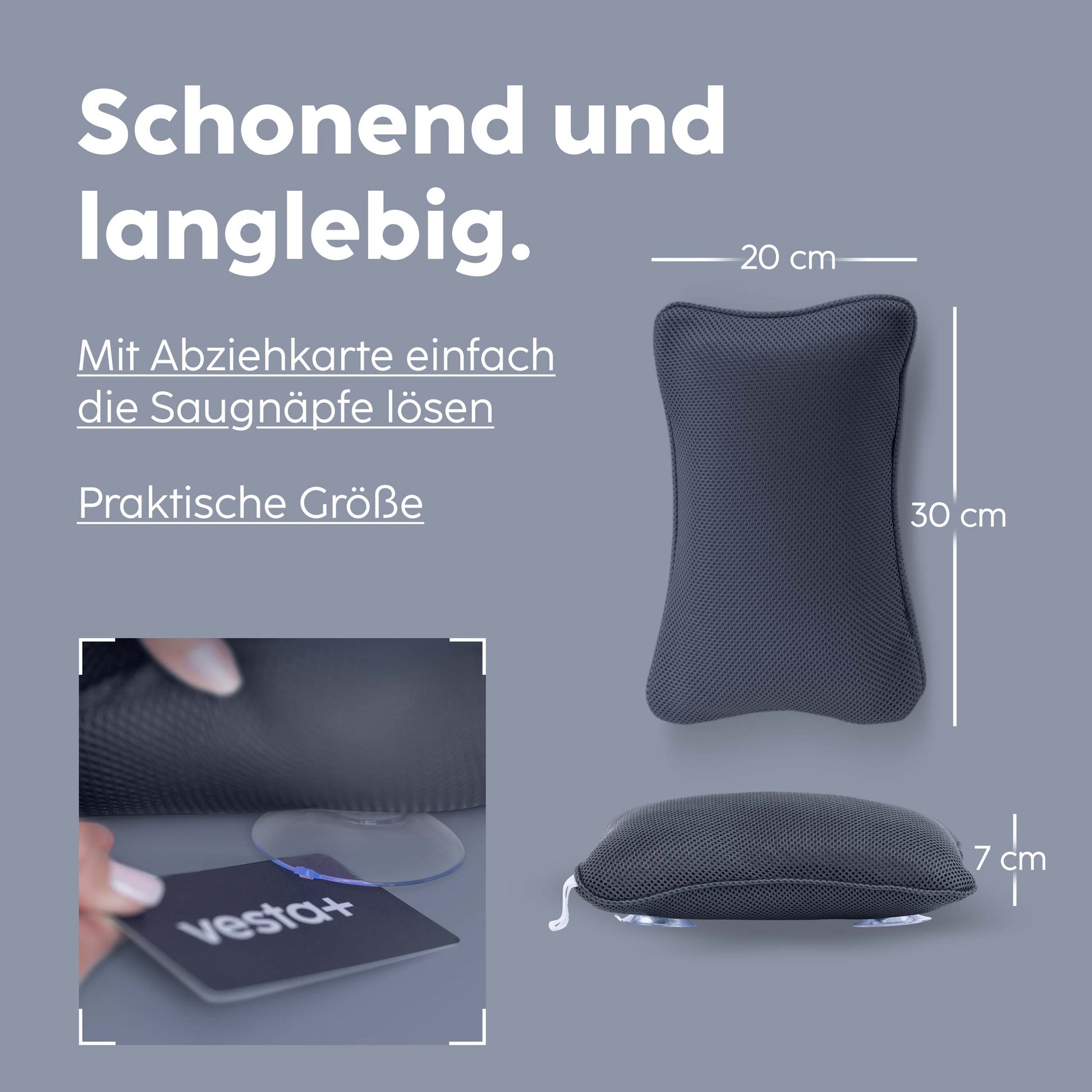 Das kleine Badewannenkissen von vesta+ ist die ideale Lösung für alle, die auch in kleineren Bädern nicht auf Komfort verzichten möchten. Dank seines kompakten Designs nimmt es kaum Platz ein und bietet dennoch eine angenehme Nackenstütze beim Baden. Das kleine Badekissen lässt sich leicht positionieren und sorgt für maximale Entspannung – selbst in schmaleren Wannen.