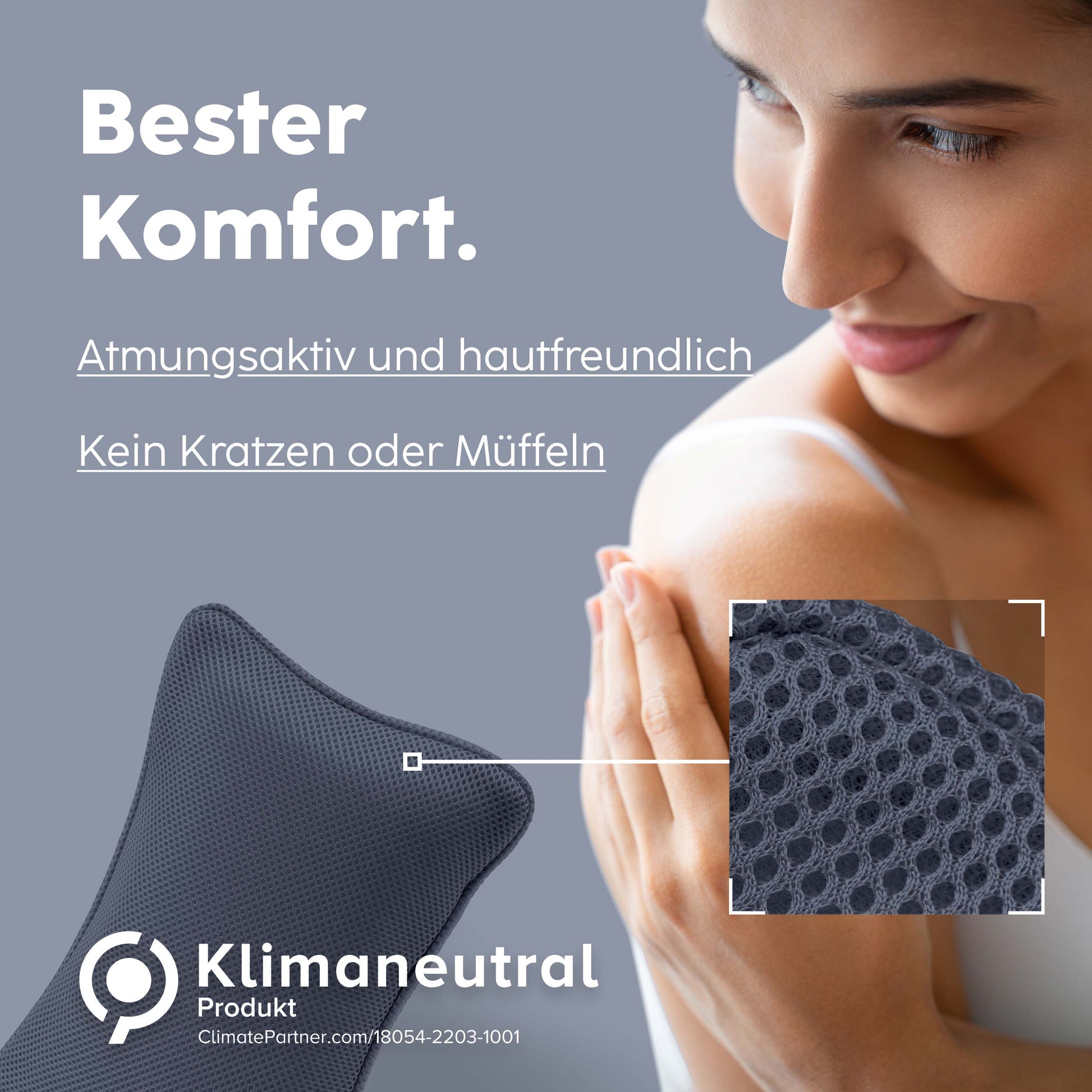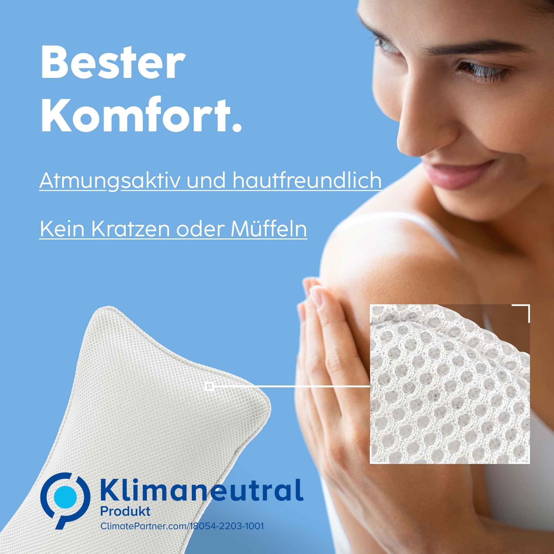Unser kompaktes Badekissen besteht aus einem hautfreundlichen Material, das sich weich anfühlt und nicht kratzt. Die atmungsaktive Struktur verhindert unangenehme Gerüche und hält das Kissen hygienisch.