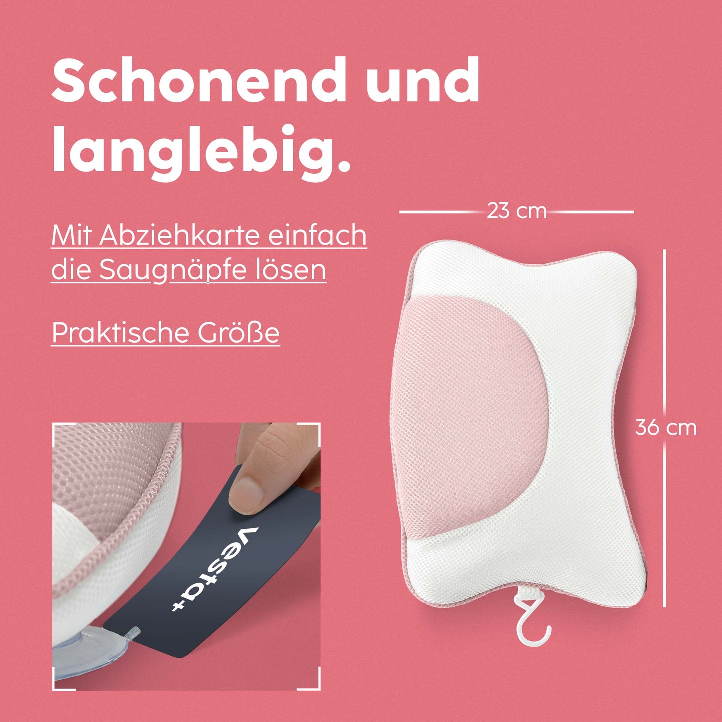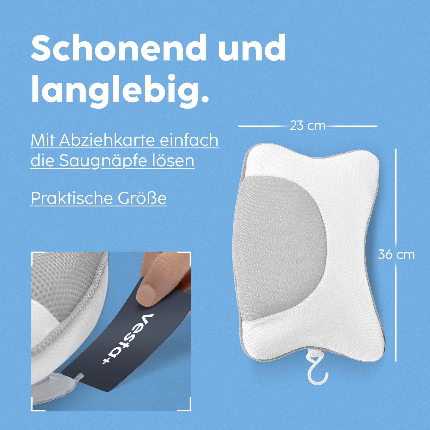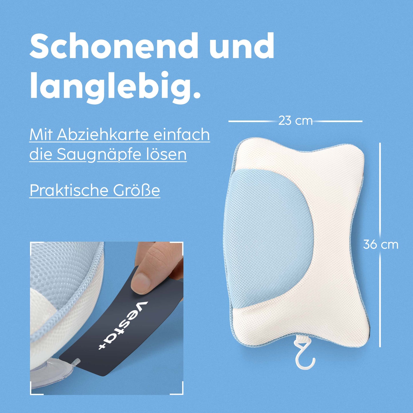 Das mittlere Badewannenkissen von vesta+ vereint Komfort und Funktionalität in perfekter Balance. Seine ergonomische Form bietet eine gezielte Nackenunterstützung, sodass Sie sich beim Baden vollkommen entspannen können. Unser mittelgroßes Badekissen ist aus hautfreundlichem, weichem Material gefertigt und passt sich optimal Ihrer Kopfform an. Dank sechs stabiler Saugnäpfe bleibt es zuverlässig an Ort und Stelle – für ein sicheres und entspanntes Badeerlebnis.