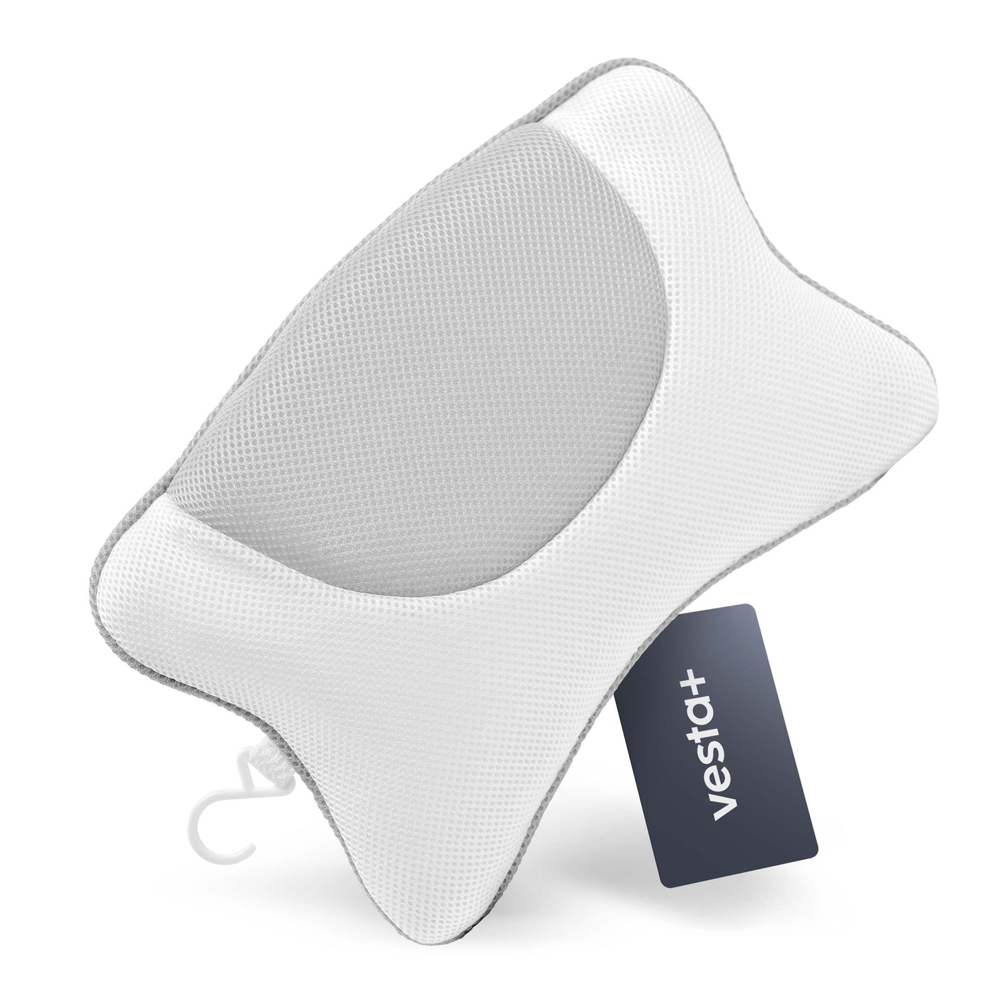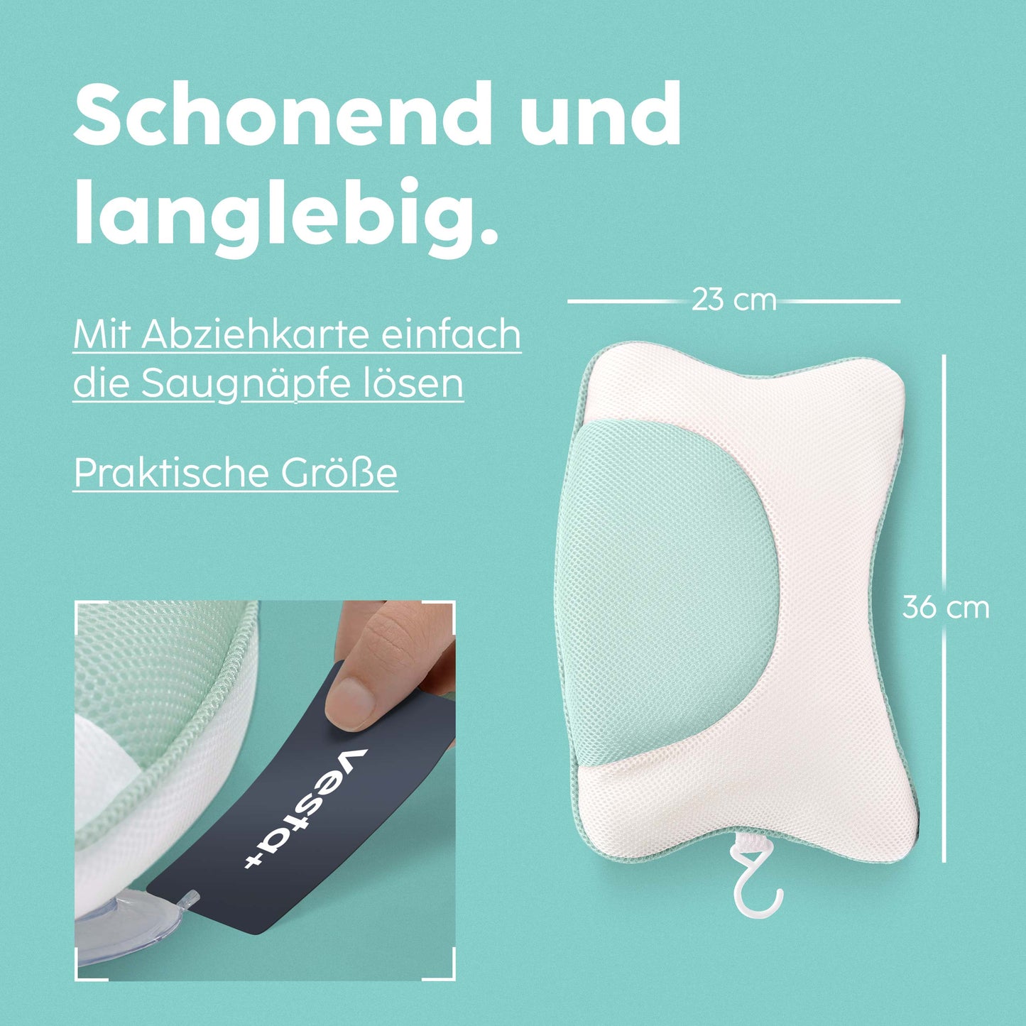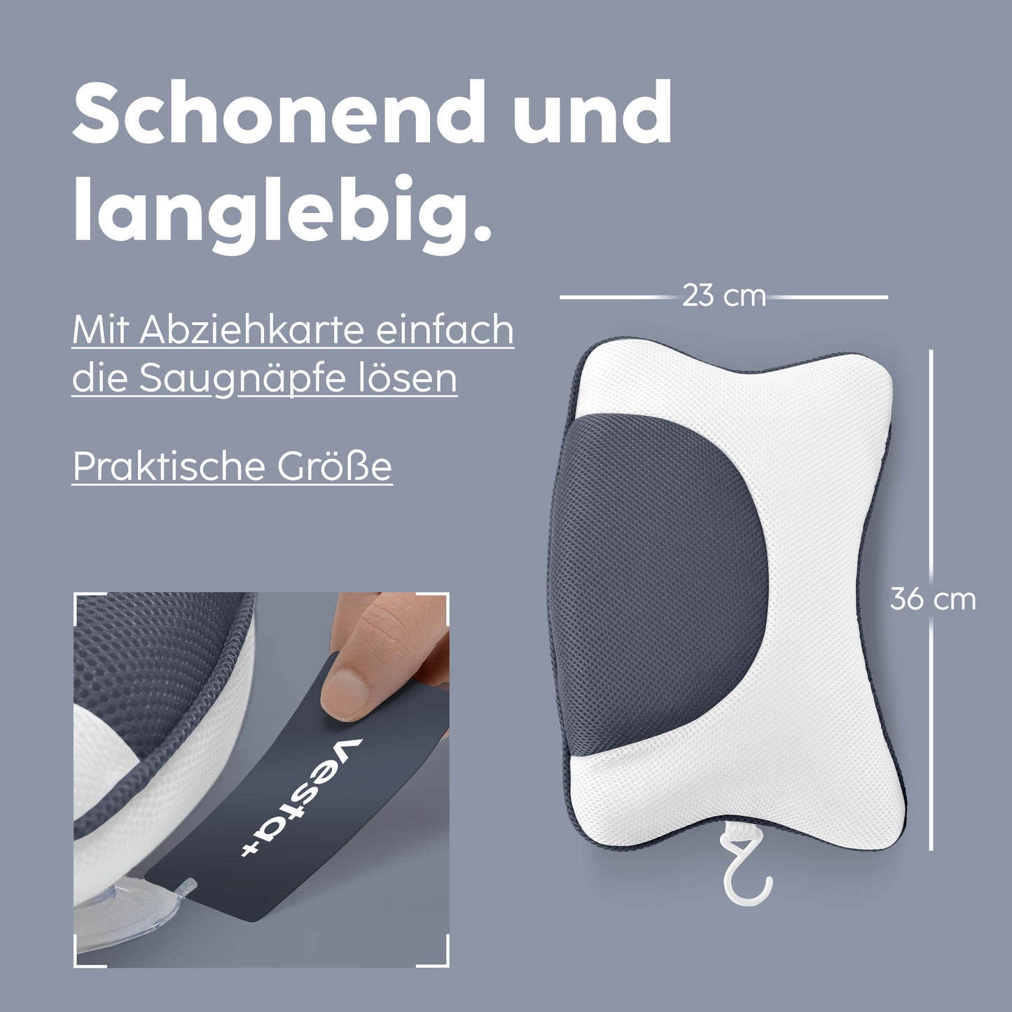 Das mittlere Badewannenkissen von vesta+ vereint Komfort und Funktionalität in perfekter Balance. Seine ergonomische Form bietet eine gezielte Nackenunterstützung, sodass Sie sich beim Baden vollkommen entspannen können. Unser mittelgroßes Badekissen ist aus hautfreundlichem, weichem Material gefertigt und passt sich optimal Ihrer Kopfform an. Dank sechs stabiler Saugnäpfe bleibt es zuverlässig an Ort und Stelle – für ein sicheres und entspanntes Badeerlebnis.