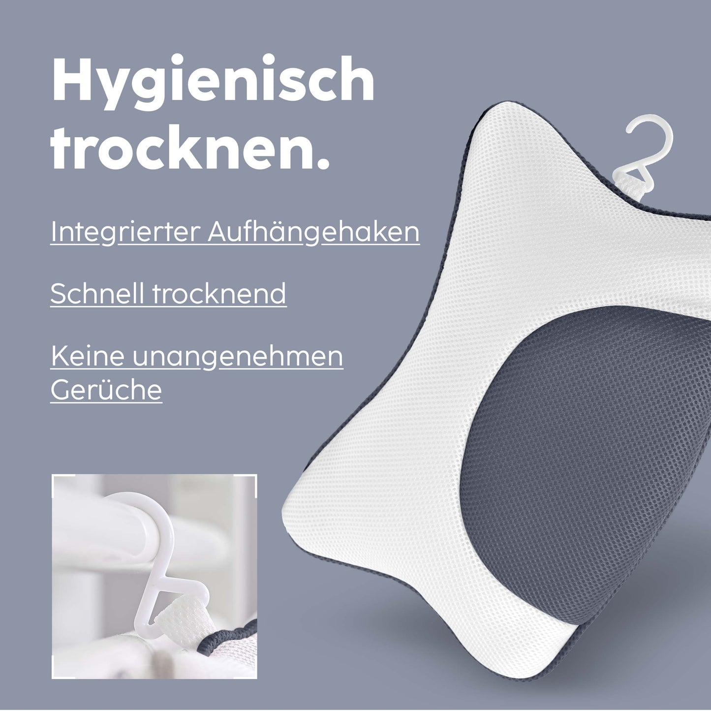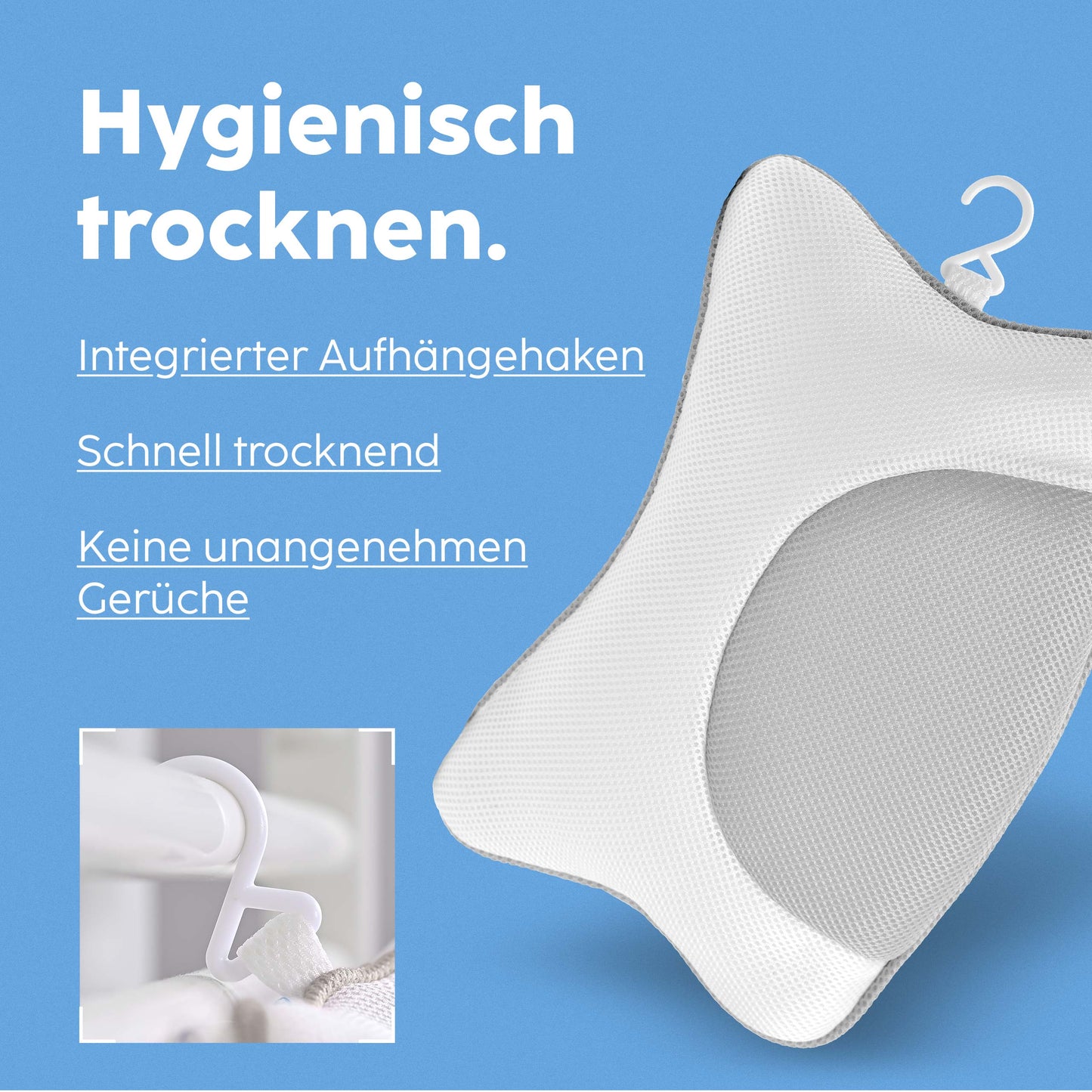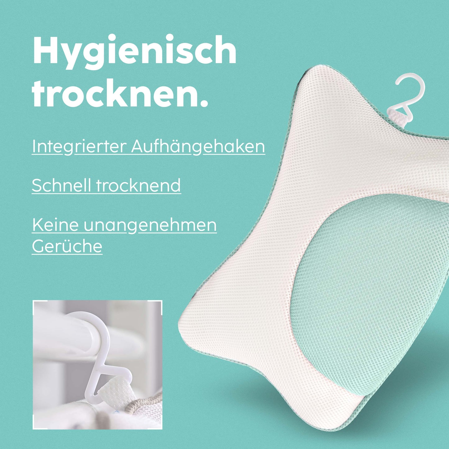 Mit integriertem Aufhängehaken ausgestattet, trocknet das mittlere Badekissen besonders schnell. So entstehen keine unangenehmen Gerüche oder Feuchtigkeitsrückstände.